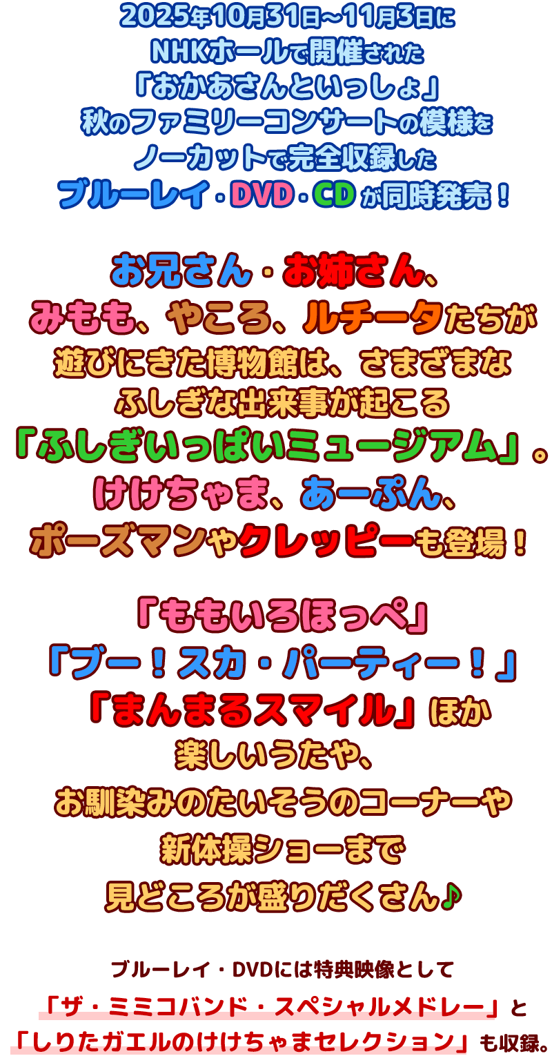 2025年10月31日〜11月3日にNHKホールで開催された「おかあさんといっしょ」秋のファミリーコンサートの模様をノーカットで完全収録したブルーレイ・DVD・CDが同時発売!