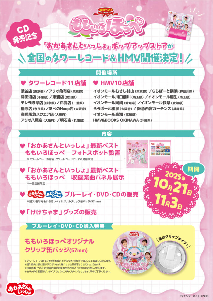 「おかあさんといっしょ」ゆういちろうお兄さん・まやお姉さん、4枚目となる年に1度のベストアルバム『「おかあさんといっしょ」最新ベスト ももいろほっぺ』の発売を記念して、全国のタワーレコード11店舗&HMV10店舗にてポップアップストアを開催!